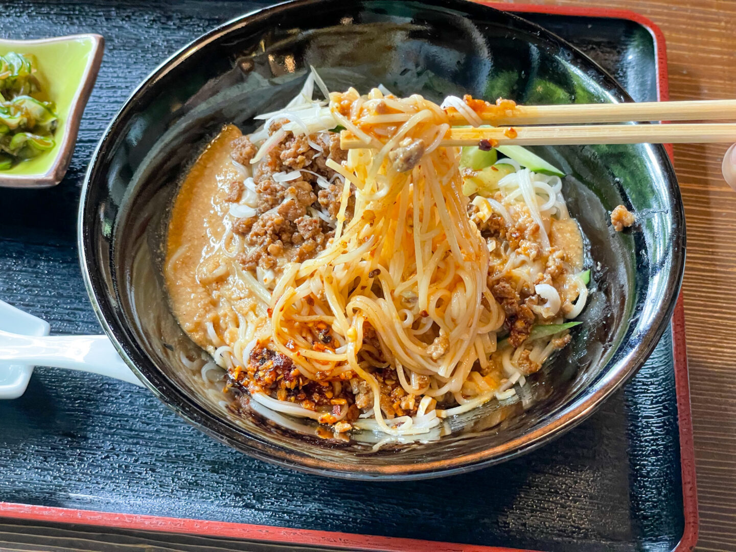 ほんのり酢が効いた坦々スープは胡麻の香りが豊かで、コクがありつつあっさりと食べられ、とてもバランスの良い味わいです。