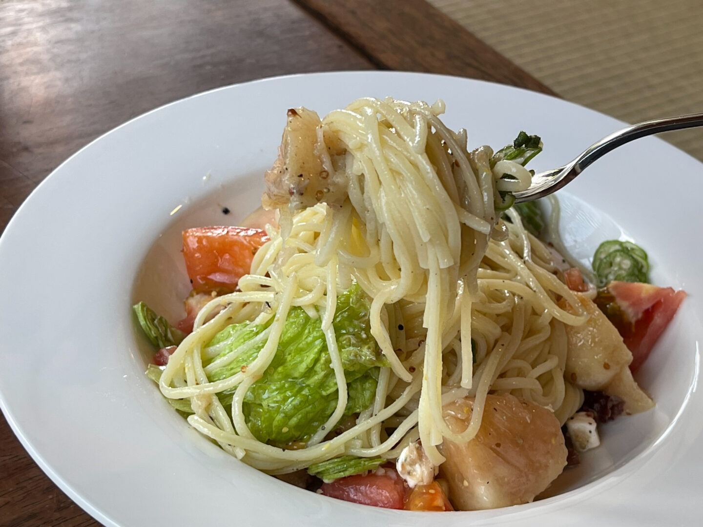 程よい酸味のパスタに、クリームチーズのコクとジューシーな桃の甘味がとっても合います!シャキッとしたレタスやオクラの食感も絶妙。